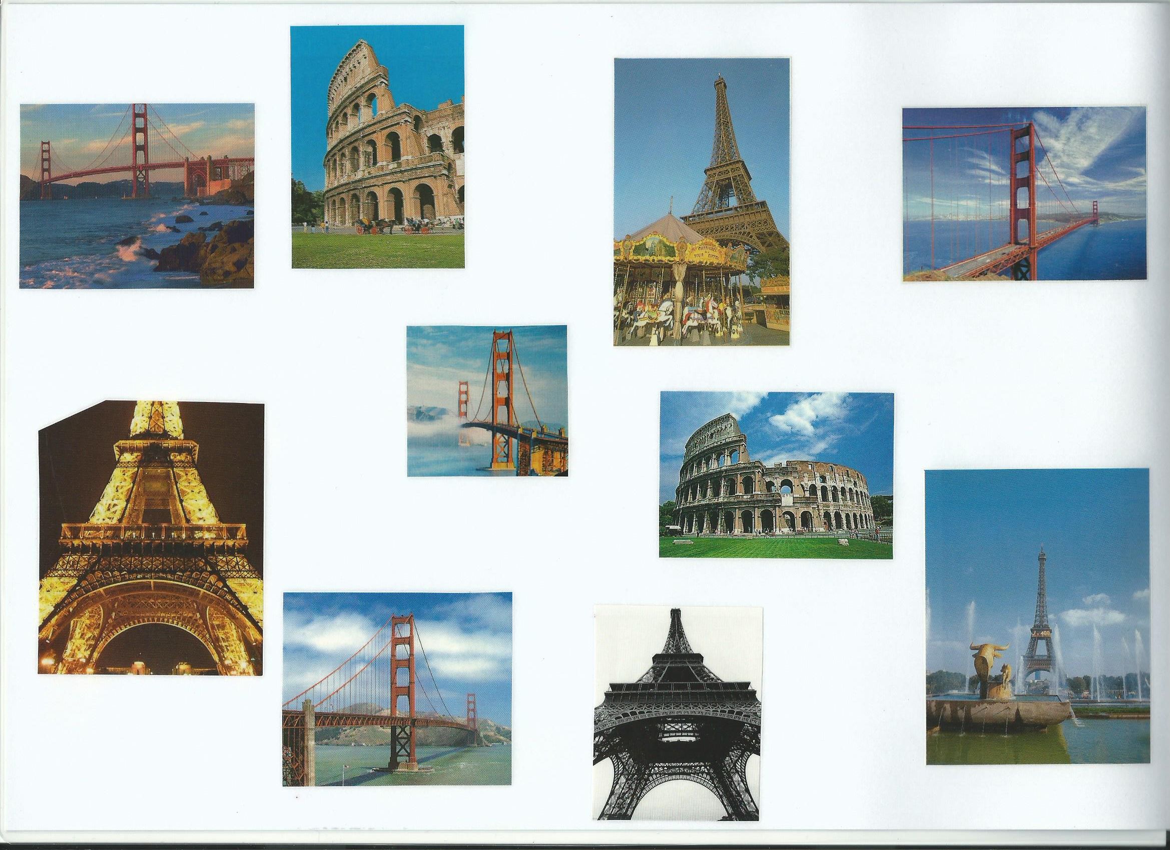 Aufgabenblätter, die ich laminiert habe, um sie mehrmals verwenden zu können, die Bilder sind größtenteils aus Zeitschriften und Werbeprospekten